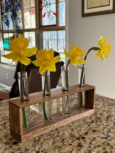 Last week, the temperatures warmed up to the seventies, and I began to think that perhaps spring would be arriving soon. And when the first daffodils started showing their blooms, I knew I had to capture some of that springness and bring it inside, showing them off in the cute flower vase my husband made for me.