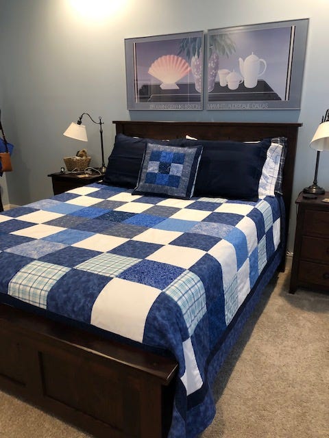 The class originally used a pattern with half-square triangles, which at the time I was not able to master. But I did learn enough to adapt the pattern to one that I could do, and ended up creating my own design. The individual squares were sewn using a machine, but the quilting and border were completed by hand. It was time consuming, but very rewarding. And I was now retired, so I had plenty of time.