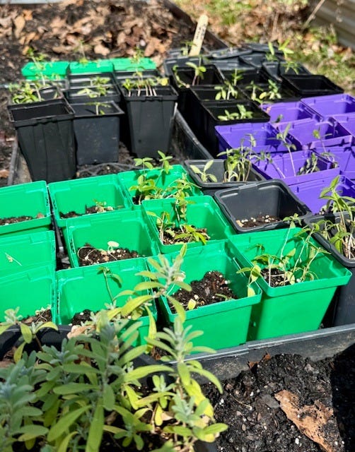 Several of the plants that had spent the winter in the greenhouse, mostly milkweed and lavender, were moved outdoors to harden off on another raised bed. Next, I brought out the snapdragon and cosmos seedlings I had started indoors under grow lights. They all got potted up, watered, and are happily ensconced in the greenhouse, since we have not yet passed the date of last frost.
