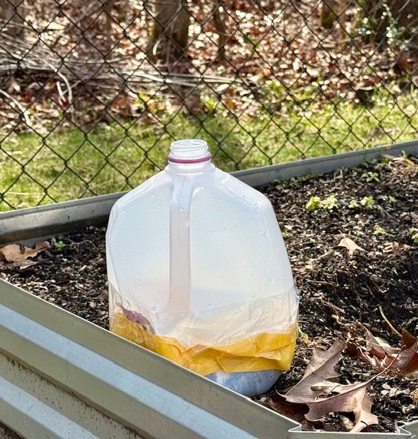 This method means that you can start plants early but leave them outside, even if it is still very cold or maybe snowing where you live. The milk jugs serve almost as a mini greenhouse, without any fuss. Plus, you don’t need to take up your indoor counterspace and any grow lights you may be using.